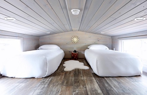 Experience a modern cabin with expansive river views, accommodating six guests with a queen-size bedroom, a lofted space with two twins, and a bunk bed with a nook, reading light and semi-private curtains. Amenities include a fully equipped kitchen, living room with sofa, 50" Smart TV, electric fireplace, and an additional Smart TV in the main bedroom. Outdoor amenities feature a private furnished patio , charcoal grill (no charcoal included), and fire pit with Adirondack chairs.