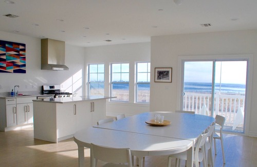 Upstairs, the main living room has far reaching views up and down the beach. It leads to a large oceanfront terrace where you can dine outdoors. On the second floor are a great room with terrace, open-plan kitchen and dining room, and small sitting area. In the back of this floor are two master bedrooms. The first floor has three bedrooms, an additional living room, front and back porches and a grassy back yard.