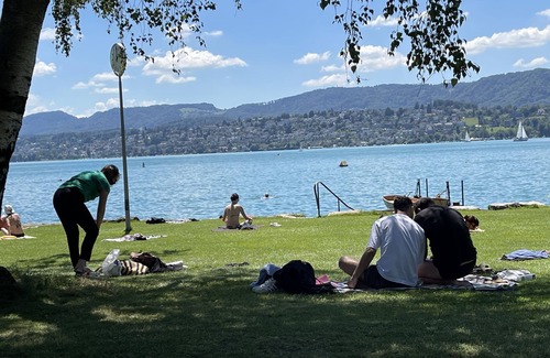 Enjoy stunning city, Lake Zurich, and Alps views from a home with wild grapevine-adorned opposite house. Features private outdoor terrace, high-quality electric appliances such as fireplaces and Miele washing machine and Samsung Frame TV, and a portable BBQ.