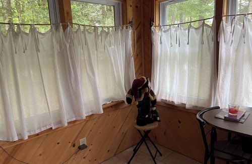 Cozy Cabin is the second lot back from the lake and is very comfortable and welcoming. We have a single bath, living room, full kitchen with all the accoutrements, including a crock pot and microwave, sweet sunroom and deck. You can see the water from the deck, in between the trees.