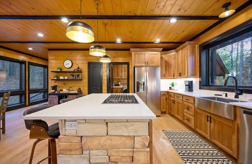 Rustic Treehouse is a luxurious 2-bedroom, 2.5-bath cabin designed to feel high in the treetops. Floor-to-ceiling windows, vaulted ceilings, a fireplace in the living room, and a 6-person hot tub create a perfect combination of modern comfort and nature immersion. Just minutes from Broken Bow Lake, Beavers Bend State Park, and Hochatown, it’s ideal for relaxation, entertaining, and memorable forest getaways.