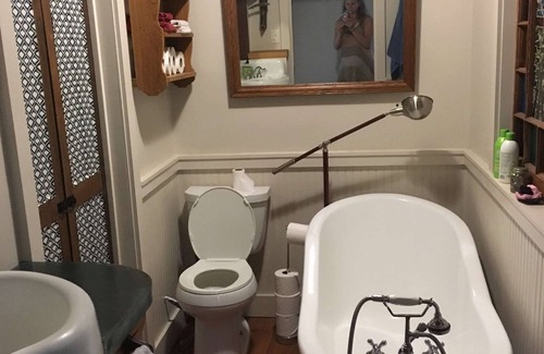 The cabin has a large screened in porch, two bedrooms, 1.5 bathrooms, a loft, modern kitchen, den, A/C, clawfoot bathtub, and outdoor shower. We have hammocks and books available for your downtime enjoyment. There is no television, phone signal is spotty at best, and wifi is unavailable. If you need to make a phone call, you can walk to the road. There are also many beautiful spots to pitch a tent on the land.