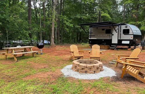 Escape to this delightful caravan by picturesque Lake Sinclair. This cozy camper features 1 bedroom with a queen bed, bunk bed, and table that converts into a twin bed, perfect for couples or a small group of guests. You will find a short 5 minute walk to a small nearby dock, suitable for small boats, canoes, and kayaks, and a 5-10 minute drive for a large updated dock with a space for fishing. Enjoy nature in the privacy of this remote and spacious area, alongside comfortable modern amenities. Our place is equipped with grilling station, firepit, picnic table, hammocks, plenty of games (including cornhole, darts, and indoor games) and more to make both long and short stays a vacation to remember.