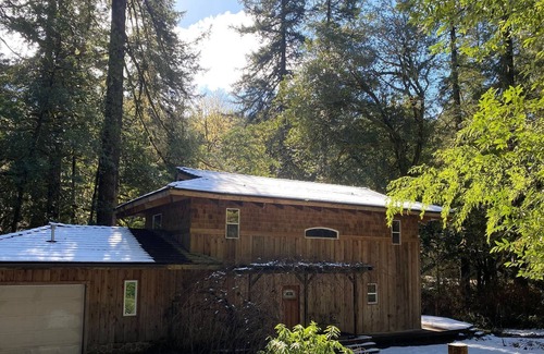 Experience the peace and tranquility this beautiful custom built "Cabin" style home located in Elliot National Forest has to offer. The home is surrounded by majestic old growth cedar and fir trees and lush natural landscape of giant fern, trillium & wild berries to name a few. There is also a beautiful array of planted rhododendron, jasmine, roses, daffodil, tulips and an enormous 50 year old wisteria draped over the front porch walkway. Several fruit trees, blueberries and fresh cooking herbs are there for guests to enjoy. The home overlooks historic Glenn Creek offering 150' of creek frontage, making it an excellent place to enjoy salmon and steelhead season! The creek also provides several private swimming holes and a small waterfall to enjoy. The backyard provides a wonderful place to relax and unwind with a glass of wine and a soak in the large covered 6 person hot tub overlooking the creek. A large expansive wraparound deck with plenty of seating and a gas grill provides a great place to barbeque, sunbathe or just relax with a good book! Evenings are especially fun roasting marshmallows, hot dogs and making s'mores in the backyard firepit. If you are a fisherman you will surely enjoy a cleaning station with hot & cold running water on both the back & front porch for guests convenience. This is also nice for rinsing off after hot tubbing or playing in the creek! The front porch is set with outdoor lighting draped from the wisteria covered awning. A metal bench and small bistro set frame the entrance to the front door.