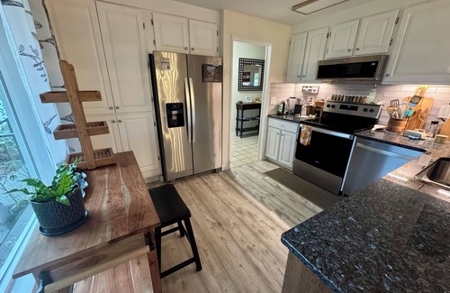 Fully equipped kitchen including necessities like coffee, tea and groceries in the pantry available . Dining room table expandable for extra room .