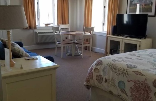 The Studio Condo Unit #215 is located on 2nd floor of the Lodge Building. It has an open concept living room, bedroom, kitchenette and a private full bathroom. Sleeping arrangements are a queen size bed and queen size sleep sofa. There is a shared deck with chairs however no view of the harbor.