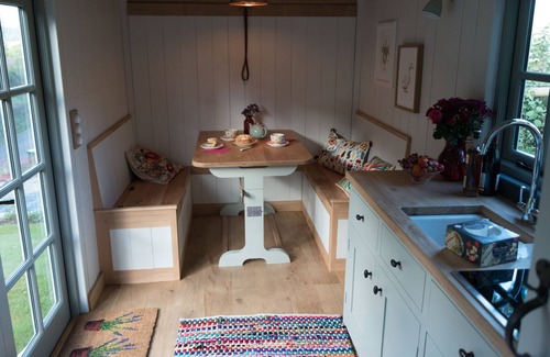 Sitting in its own pretty and private garden, Duck Hut has everything you need for your stay. There’s a fully equipped kitchen with hob, sink, fridge and microwave and space for four to dine together. At night enjoy pulling down your full sized, comfortable double bed and rest assured there’s a shower and loo too.