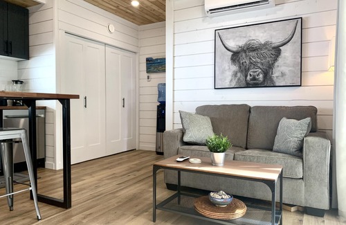 It makes sense that the heart of the home - the kitchen, is located directly in the center of this home. Fully stocked and ample space to cook up your hearts desire. There's a bar height island table with seating for 4, that is open concept and flows nicely into the living area. With one wall of the kitchen/living area made up of glass with sliding patio doors, the room easily opens up to the outdoor deck patio area. Here, your family can all sit under the covered pergola, or uncover it to gaze at the stars. This outdoor patio area is such a flexible space that offers the perfect gathering spot, whether hanging out at the Buoy Bar, relaxing in the HOT TUB, chilling on the patio around the propane fire table or grilling up some grub on the BBQ. You will find 2 private bedrooms at each end of this Sea Can home, set up with queen a bed in each. The master bedroom has a beautiful and spacious 3-pc ensuite bath and a second main bathroom located just off the second bedroom.