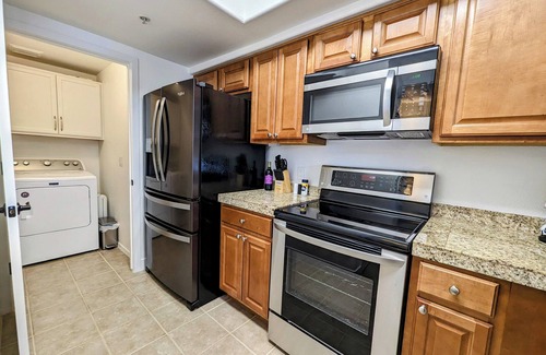 Fully equipped kitchen and new stainless steel kitchen appliances! Separate laundry room with new, full-sized washer and dryer. Flat screen TVs in living room (Smart TV), primary bedroom (Smart TV), and second bedroom. Cable TV and wireless high-speed internet provided (250+ mbps). Split floor plan.