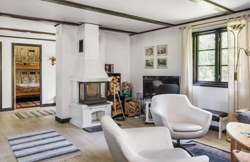 "Skogsgläntan", 4-room house 75 m2. Cosy furnishings: living/dining room with Scandinavian wood stove, dining table, satellite TV and DVD. 1 room with 1 double bed. 1 room with 1 x 2 bunk beds. 1 room with 1 double bed. Open kitchen (oven, dishwasher, 4 ceramic glass hob hotplates, toaster, kettle, microwave, freezer, electric coffee machine). Exit to the garden. Shower/WC. Electric heating. Wooden floors. Barbecue (portable). Facilities: washing machine, iron, children's high chair, baby cot. Internet (WiFi, extra). Please note: one double bedroom is outside the apartment. Non-smoking house. No internal connecting door between the separated properties. Freezer approx. 90 l.