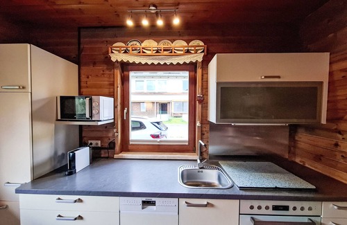 4-room house. Object suitable for 6 adults. Cosy and wooden furniture furnishings: living room with satellite TV. Exit to the balcony. 1 double bedroom with Dressing room. 1 room with 1 bed (120 cm, length 200 cm). Kitchen (oven, dishwasher, 4 ceramic glass hob hotplates, toaster, kettle, microwave, electric coffee machine, Capsules for coffee machine (Nespresso)) with dining table and wood-burning stove. Bathroom, sep. WC. Heating. Solar power. On the lower ground floor: living/sleeping room with 1 sofabed (90 cm, length 200 cm), 1 double sofabed (160 cm, length 200 cm), Scandinavian wood stove, dining nook, kitchen corner and flat screen. Exit to the terrace. Kitchenette (2 hot plates, electric coffee machine, Capsules for coffee machine (Nespresso)). Shower/WC. Wooden floors. Comfortable furnishings in the country house style. Balcony furniture. Beautiful panoramic view of the mountains. Facilities: washing machine, dryer. Internet (WiFi, free). Please note: suitable for families. Fridge without freezer, non-smoking house. Smoke alarm, fire extinguisher.