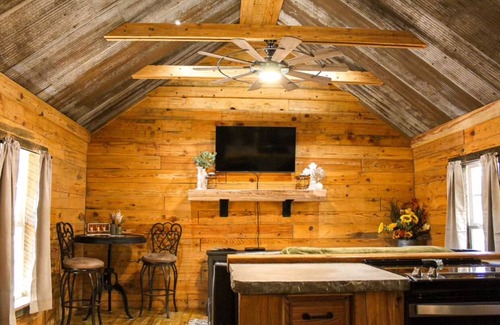 The Livingston Junction Conductors Log Cabin in, Eureka Springs boasts 1 inviting bedroom with a cozy queen bed. Enjoy the pleasant AC and heating during your stay, along with an electric fireplace, 50' TV with DVD player, DVDs provided.After your day exploring the area enjoy a bathroom featuring a refreshing rainfall shower with pebbles stones. Hand crafted Log cabin in the woods, by Leatherwood creek with beautiful views . Sitting on the deck in your wooden rocking chair, snuggled with your cozy blanket looking at the stars, seeing the silhouette of the Ozark Mountains. Queen bed, full kitchen, rain shower with slate rock, electric fireplace, rocking chairs, leather reclining couch this is a great cabin feel and will keep you cozy all through any season. Couples retreat, to set your gaze back to your loved one.