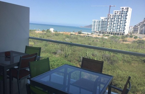 Apartamento iluminado, vista al mar y a la sierra. Playa privada, salida directa al mar. Esta ubicado a cinco minutos del aeropuerto. El conjunto cuenta con 3 piscinas y restaurante. Servicio adicional - incluye empleada que hace el aseo y ayuda a cocinar