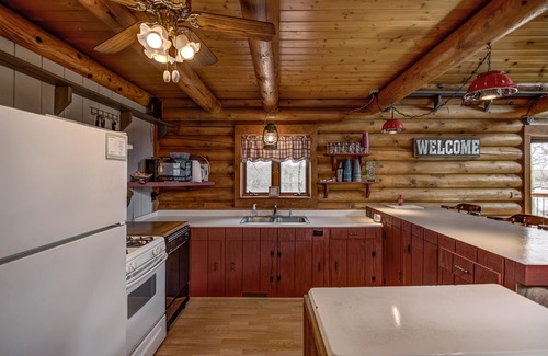 Towering Oaks Lodge, a four season, chalet style, authentic log home features a comfortable interior with 2 bedrooms, 2 bathrooms and a spacious loft. You can gather around the dining table and kitchen seating for meal time and relax in the cozy living room area in front of the wood burning fireplace. The lower level offers more room to spread out with an additional seating area, high top table, pool table, ping pong table, smart tv and spare refrigerator, counter top and small sink.