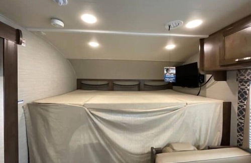 The RV features a full kitchen and bathroom, two TVs, a DVD player for the main TV, Amazon fire hookups on each TV (use personal logins), ample storage space in closets and drawers and an outdoor shower.