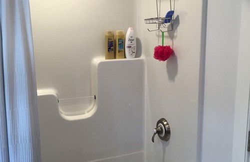 The Master Bedroom has a queen size bed, 2 Bureaus, Closet and shower bathroom. There are sliders leading to a small deck.