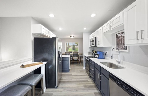 The fully equipped kitchen has everything you need to whip up group meals. Gather around the dining area or settle into the inviting living room, complete with a 65-inch smart TV. Head downstairs to the rec room for a true entertainment zone—there’s a 75-inch TV, arcade machine, foosball, and plenty of board games.