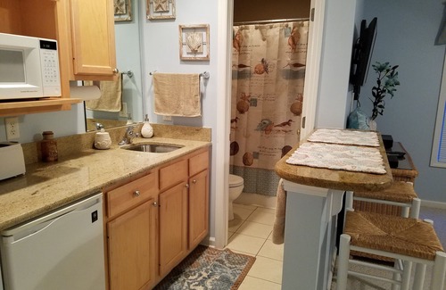 Centrally located in the gated golf course community of St. James Plantation, our ground-floor villa features hardwood flooring, crown molding, and wi-fi throughout. The full-size kitchen has been updated with granite countertops, and crisp-white, room-brightening appliances. The living room features a sofa, loveseat, and 50" TV. The master bedroom boasts a king-size bed, chest, dresser, TV, night-stands, and a large walk-thru closet, that leads to the full-size master bathroom. The laundry room is fully equipped with washer and dryer. The guest suite includes 2 queen-size beds, kitchenette with granite countertops, mini-fridge, toaster, coffee maker, microwave, TV, and a full-size bathroom. The screened-in patio features a wicker table and chairs.