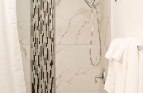 The bathroom is equipped with a hair dryer, ceramic flat iron, first aid kit, magnifying mirror, handheld shower head, & 100% vegan & cruelty free shampoo, conditioner, & body wash. Find extra towels in the bathroom vanity.