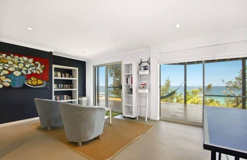 Spacious 5-bedroom Manyana beach house with panoramic ocean views & private balconies. Walk to boat ramp. Perfect for multiple families enjoying coastal living.