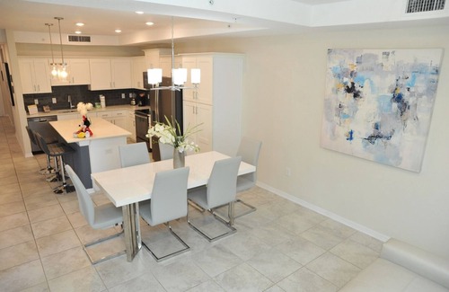 Open‑plan living room with smart TV, dining for the whole family, and a fully equipped kitchen (full‑size appliances, coffee maker, blender, cookware/utensils, dishwasher) — perfect for quick breakfasts before the parks.