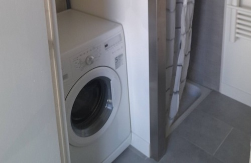 The kitchen is equipped with an oven, a stovetop, and a refrigerator, as well as a coffee maker, an electric kettle, and a microwave. And you can even travel light because you'll have a washing machine.