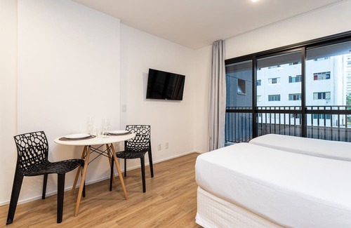 This nice studio with 31m2, located in the heart of São Paulo is the perfect combination between practicality and comfort in one of the most connected areas in São Paulo. The apartment is functional and has a full kitchen and air-conditioning. The building is modern and has parking, swimming pool, gym, laundry and sauna that you can enjoy during your stay. You will be a few meters from República subway station and next door with easy access to Consolação avenue.