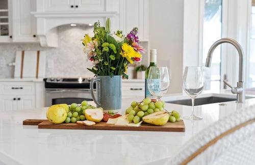 Modern, fully equipped kitchen with ocean‑view sink, island, and breakfast bar