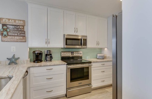 Amenities include: entry security gate, direct access to boardwalk, Wi-Fi, stack-able washer/dryer, fully equipped kitchen with all new appliances, granite countertops and breakfast bar.