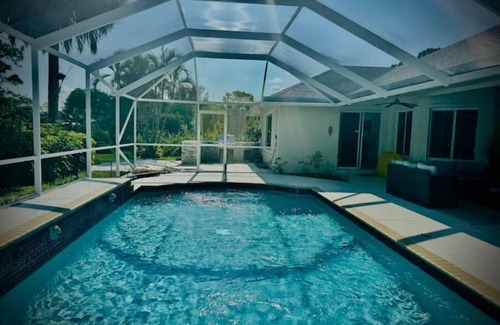 Poolside Luxury: Enjoy the large, private heated pool set against the backdrop of tropical landscaping, perfect for soaking up the Florida sun.