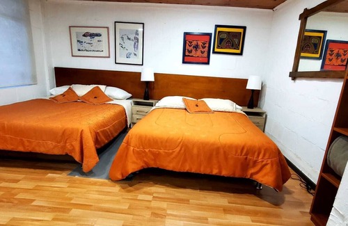The suite has two double beds, a smart TV, a kitchen space for making coffee, juicing and heating food in a microwave. It has a private bathroom, hot water and towels. It also has a living hall overlooking the internal reservoir and the beautiful Neusa reservoir which has lounge chairs and a work area. It has high-speed satellite internet. The suite is on the farm the box that has 45,000 square meters through which you can take internal walks, see the activities of a farm such as milking cows, trout fishing in the reservoir in seasons, rest in the hammock area, play with pets and admire the peacocks. Enjoy reading books on benches distributed among nature, a BBQ (the price of a bag of charcoal is 20 thousand Colombian pesos) or enjoy the night around an external fireplace under the cloudy or starry skies of the secto and the spectacular sunrises and sunsets. The stay includes a full breakfast with fruits, cereal, arepas or bread, free-range eggs and cheese from the region. We offer lunches for an additional cost between 25 thousand COP and 35 thousand per person depending on the menu and previously booked and also a light meal that can be a sandwich or hamburger with drinks for 15 thousand COP per person. If you wish, you can cook your dinner, for which we will provide access to a full kitchen in the owners' house