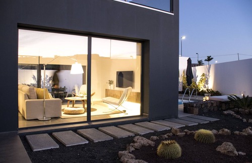 Modern newly built villa of modern and functional design in exclusive residential north of the island of Fuerteventura, with 3 bedrooms private pool, brand new air conditioning. Fully equipped kitchen. Ground floor with living room kitchen bathroom and bedroom. 2nd floor with 2 bedrooms bathroom and terrace. The house is equipped with air conditioning in all rooms. In the outdoor area pool with outdoor terrace solarioum furniture, and private garage. Maximum occupancy 6 people,