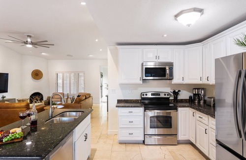 The bright, open-plan living area in the main house combines modern elegance with comfort, featuring a sleek, smart TV, modern designer furnishings, and easy access to the outdoor patio, which leads to the attached casita and pool/spa area with gazebo. While the fireplace is non-functional, the space still feels warm and inviting, thanks to the stylish decor and seamless connection to the well-equipped kitchen. Complete with stainless steel appliances and all essential cooking amenities. The kitchen flows into a dining area that comfortably seats six, with an additional breakfast nook offering seating for four, making it perfect for both entertaining and casual meals.
