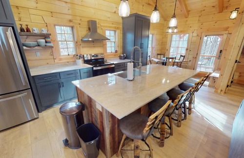 Welcome to Sunset Ridge! Brand new in 2023, Sunset Ridge is an Amish-crafted Hochstetler log home, custom designed by the owners. Situated high atop a western slope with gorgeous views all around, you'll especially enjoy watching the stunning sunsets! Inside, you will love the easy, spacious, open floor plan, anchored by a massive kitchen island made of reclaimed Ohio barn wood, and a floor to ceiling stacked stone gas fireplace in the great room. Dekton counter tops, Amish made cabinets & furniture, and stainless steel appliances finish the chef's kitchen. On the lower level, a love seat lounge makes way to two private bedrooms, and a full bath with a spa-like custom tile shower. Outside, plenty of parking space, a fire pit, picnic area, and a seasonal bunk house with two full size futons, a kitchenette, and attached deck provide multiple venues to enjoy the beautiful, high elevation wooded setting. Perfect for couples and small families of up to four, Sunset Ridge is the ideal base camp to explore the gorgeous Hocking Hills area. Centrally located on a quiet, well maintained county road, it's just a quick six miles to Old Man's Cave, with equally easy access to all the other parks & attractions of Hocking Hills.
