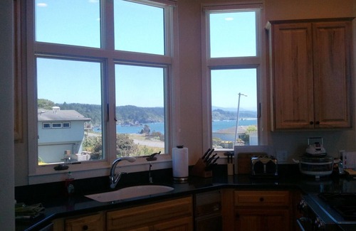 Enter on lower level which has one bedroom with a queen bed and a full bathroom with shower. The upstairs includes living and dining room, kitchen, two bedrooms, a sun-room w/ a Queen futon bed and two more bathrooms. The upstairs living/dining room offers an open floor plan that makes for easy entertainment. Cozy up by the gas fireplace while sitting inside watching the seascape all around or watch a movie on the large flat-screen T.V. Grill dinner on the propane barbecue and enjoy cocktails on the deck. Watch the sunset over the ocean while dining outside at the bistro table and chairs. The main suite offers a king bed, private balcony and main bathroom with shower and large bathtub. All of the bedrooms and sun-room have ocean views. The 3rd bathroom is just across the hall from these bedrooms and has a great walk-in shower. Sunset Vista is filled with beautiful photographic art taken from around the world. Radiant floor heating keeps this house comfortably warm. Sunset Vista is only 500 feet from Trinidad Harbor, pier and beach. This is a "no shoe" house which keeps it in pristine condition. Onsite parking available for up to 4 vehicles.