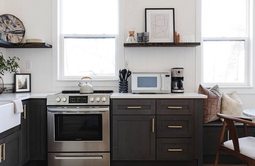 Inside the cabin, you`ll find this 500 sq ft tiny cabin lives quite large. With an open living room, kitchen, dining area + a two-story ceiling, you`ll feel the bright and modern comfort and functionality of this dreamy cabin.