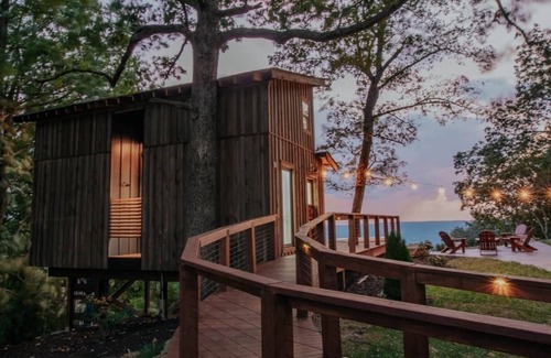 The Artistree House on Lookout Mountain is a brand new luxury treehouse with panoramic views and a spectacular sunset. The treehouse features an a fully functional kitchen, (mini fridge, induction cooktop, and convection microwave) a traditional king bed, queen pullout couch, projector to use in eveningsand a full bathroom. Outdoors, you will find ashower, hot tub, fire-pit, pizza oven and charcoal grill. This treehouse can sleep up to 4 guests but is well suited for 2 guests as there is no bedroom door.This is a place to relax, unwind and get inspired.