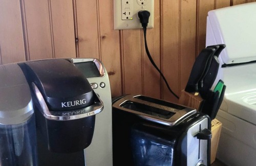 KITCHEN – Galley kitchen extremely well-stocked with stove/oven, refrigerator, microwave, Keurig & Mr. Coffee 12 cup coffee machines, dish sets, silverware, pots and pans, mixing bowls, pitchers, cups, wine glasses, mugs, toaster, toaster oven, waffle iron, blender, crock pot, knife set, food chopper, pantry items – everything needed to prepare meals at the cottage.