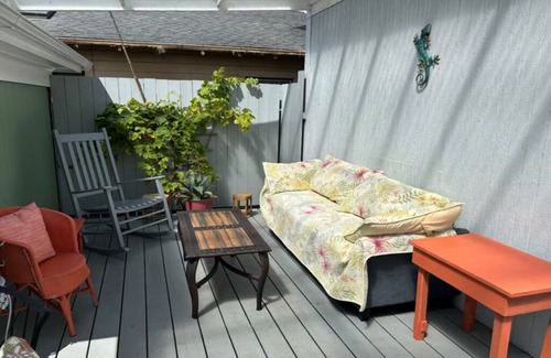 The adorable, private deck overlooks a lush, verdant yard, providing a serene space to relax with your morning coffee or unwind with a glass of wine in the evening. It's the perfect spot to soak in the beauty of nature and enjoy the peaceful surroundings.
