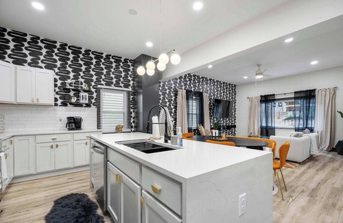 Inside the stylish home, chic décor meets luxurious furnishings, surrounding you in comfort and elegance. The living room offers a plush sofa and armchair along with a large, mounted smart TV, your entertainment hub for streaming a new movie or bingeing episodes of your favorite shows. Flow with the open floor plan into the kitchen and dining area, an attractive space for all your mealtime needs. The kitchen is fully equipped, showcasing stainless steel appliances, crisp white cabinetry, and glossy countertops with gold accents. High-top stools at the spacious island provide an option for dining on quick meals or a spread of afternoon hors d’oeuvres, while the dining room table with bold accent chairs can seat 6 for more formal gatherings. Back outdoors, enjoy a warm fire and the fresh air at the above ground firepit surrounded by comfortable Adirondack seating.