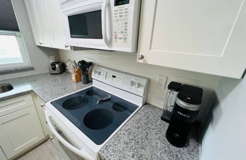 This one bedroom, one bath vacation destination offers you all the comforts of home. The open concept kitchen, dining and living area provides a bright, free-flowing space. The kitchen, which overlooks the pool, includes all you need to prepare a homemade meal. You’ll enjoy laying back on the couch, throwing your feet up and relaxing to your favorite show on our 4K UHD 43” Smart TV. Just log into your favorite streaming app and enjoy! After an exciting day on the beach, exploring our historic town, or a day-trip of discovery, you’ll be welcomed into slumber by the most comfortable king-sized bed! If you need some time to stretch out in bed and wind down, grab a book or enjoy the 32” smart tv.