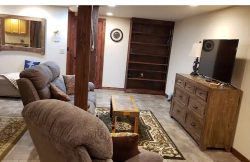 The Hideout is located in the back half of a two-story workshop, with a view of the horse pasture and pond on the other side of the fence. Guests will have a private entrance and parking. A 50" smart tv is here to use with your streaming accounts.