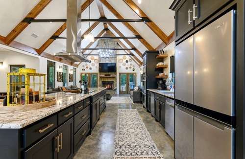 Continuing from these cozy lounging spots, you'll come upon a lovely dining space featuring a 6-person table, seamlessly connected to the chef's kitchen. If you have a passion for cooking, you'll adore the beautifully designed and well-equipped kitchen - a dream come true for any cook. With quartz countertops, a spacious island with seating for 6, an electric 5 burner range, a microwave, a dishwasher, double oven, commercial ice maker, and an outdoor gas grill complete with provided propane just steps away, everything you need is at your fingertips. Prepare scrumptious meals that bring people together with ease!