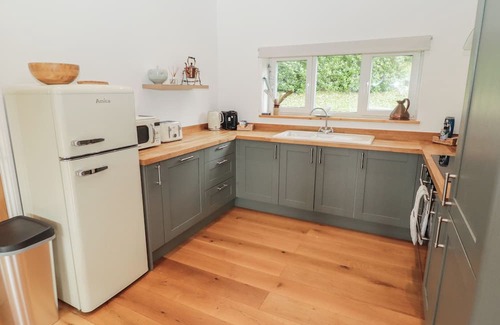 The Lodge, a bungalow, consists of open plan kitchen featuring electric oven and hob, fridge, freezer, microwave, dishwasher, coffee maker, kettle, toaster, a dining area with seating for four guests and sitting area with a Smart TV. There are two bedrooms with TVs, a king-size with en-suite walk-in shower, basin and WC, and a twin with en-suite walk-in shower, basin and WC. Outside you will find an enclosed garden with patio, furniture, barbecue, hot tub, access to shared grounds with goats, peacocks, duck pond, and off-road parking for 2 cars. Within 1.3 miles, you will find a shop, within 0.5, a pub, and within 0.3 miles a river. Please note that this is a non-smoking property. WiFi, fuel, power, bed linen and towels are all included in the price. Two well-behaved pets allowed. Note: Please keep dogs on leads or in sight due to nearby wildlife. Note: This property has a Good Housekeeping bond of GBP 250.