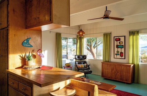 A secluded retro Joshua Tree retreat w/ breathtaking panoramic views. This 2 bed 2 bath home is situated on 2.5 acres of desert with 12+ Joshua trees on the property. Amenities include a retro kitchen, 1950s oven/stove, workspace, barbecue, hot tub, cowboy pool (seasonal), fire pit, horseshoes, TV, new heat/AC, fast wifi, and more! Come experience world-class stargazing with zero light pollution. 15 min to DT Joshua Tree, 25 min to the Park Entrance!