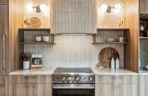 Our fully equipped kitchen is framed by statement stone counters and counter-to-ceiling tile. Cook up our favorite dishes while gazing out to the garden. The built in dining booth comfortably seats 8 and feels like your own elevated restaurant.