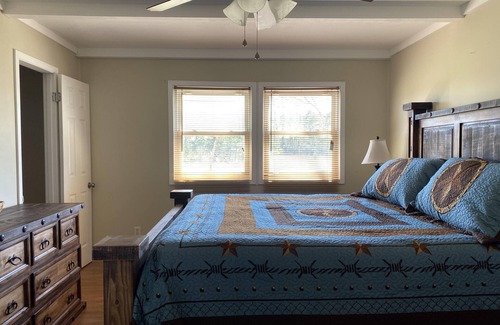 Cute Farmhouse sitting in the middle of 8 secluded acres! HUGE country kitchen with wood burning stove! The 3 (all King) Bedroom/3 Private Bath home (plus 1 Queen size rollaway bed) is furnished west/southwest style, featuring wood floors, big kitchen table, beamed ceilings, reclaimed wood walls in one bedroom, TV - Wi Fi, and big Texas rocking chairs on the front porch.