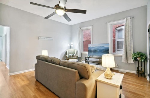 This property is a 3 bedroom, 1 bathroom unit that is located on the 2nd floor of a duplex. The large bedroom is the largest room in the house and has a queen-size bed, chest of drawers, night tables, sitting area and 43 smart TV. The medium bedroom has a full-size bed, night table, chair, chest of drawers, and 43 smart TV. The third bedroom is furnished as an office, but can be converted into a twin-sized bedroom upon request. The living room has plenty of seating and a 55 smart TV. The kitchen is fully stocked with basic appliances, pots, pans, dishes, cutlery and other basic kitchen items. All bedding and towels are provided. You will only have private access to your bedroom, and off limits of the other bedroom rented, but the rest of the home is shared with the other guest.