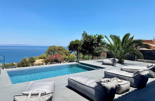 Three Elements is a villa of approximately 200 square meters with private pool built in 2005 on a slope of one acre overlooking the magnificent Saronic Gulf and its islands in the settlement of Pefkali. The house is surrounded by slopes with trees, stones and sea giving the name of the house.