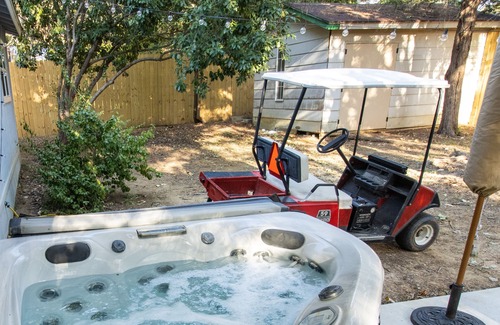 Escape the hustle and bustle of the city to Tiki Paradise's backyard that includes a hot tub, tiki bar, fire pit, and a golf cart for ease of access!